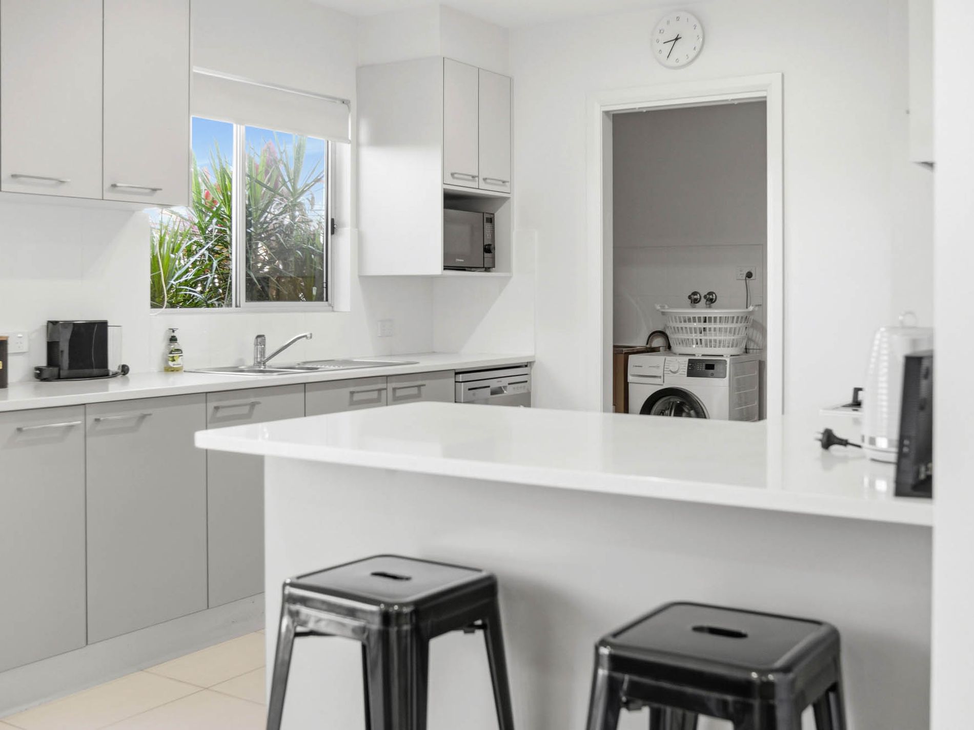 The townhouse features a contemporary design with an emphasis on natural light and open living space. The well-appointed kitchen, complete with modern appliances, overlooks the spacious living area, creating a perfect setting for entertaining guests or simply unwinding after a day at the beach.